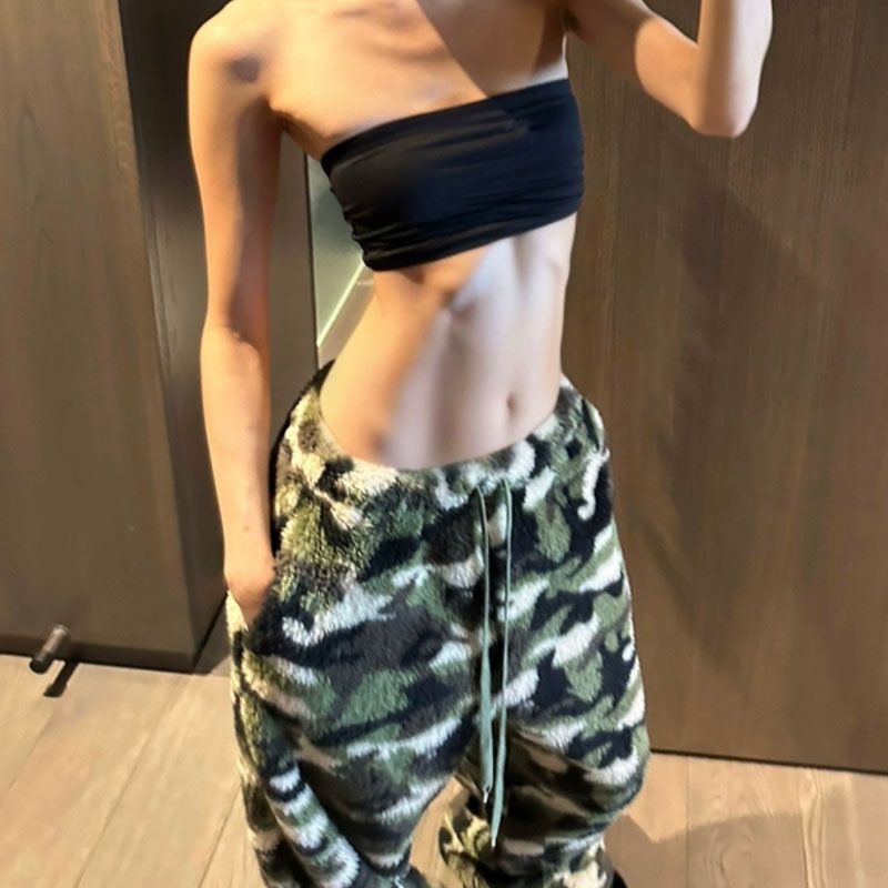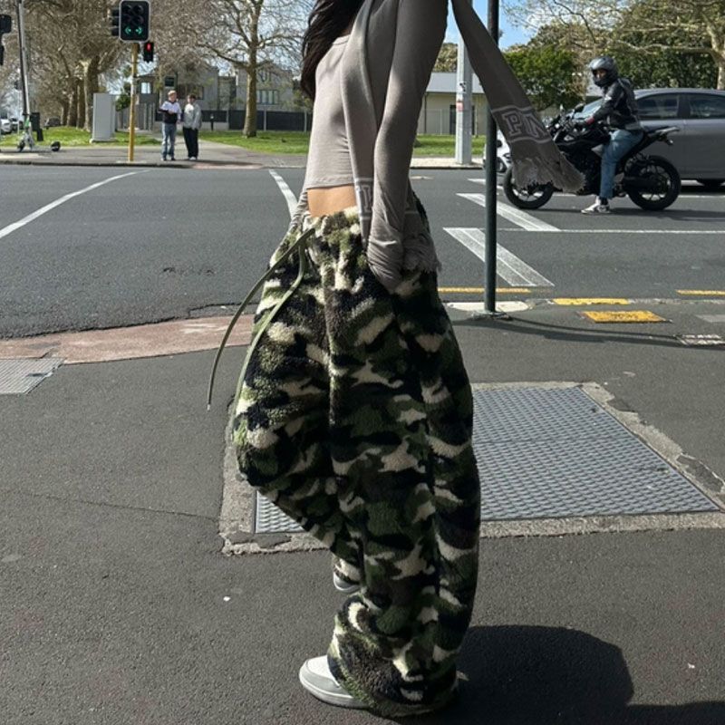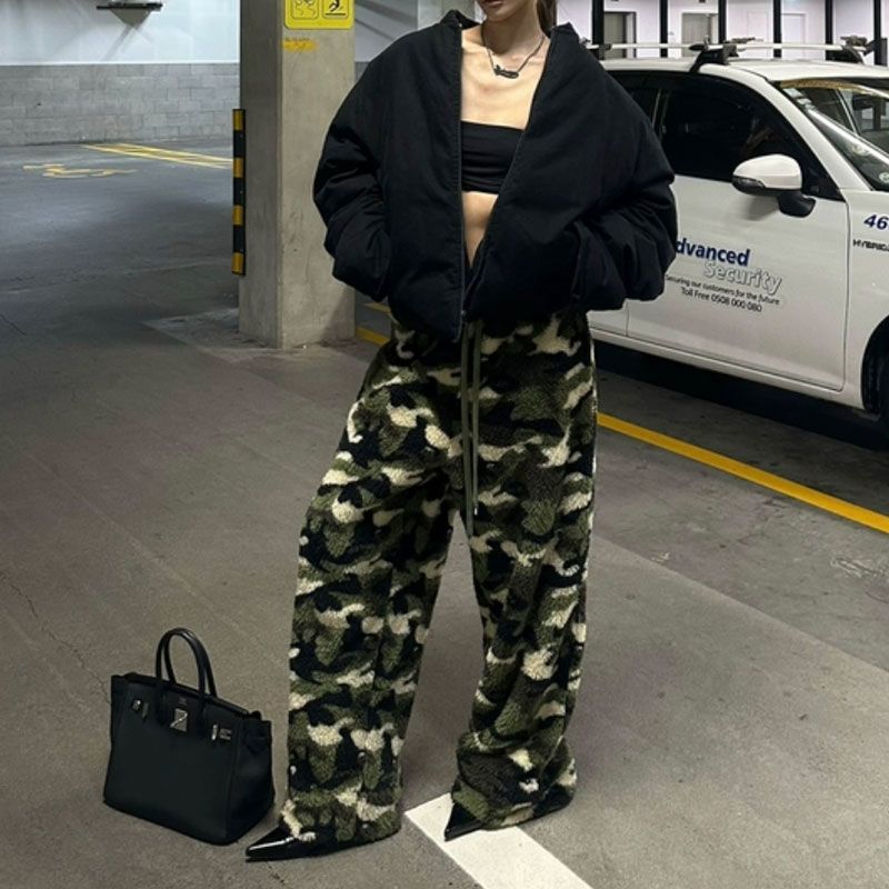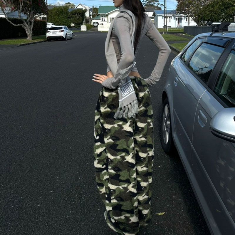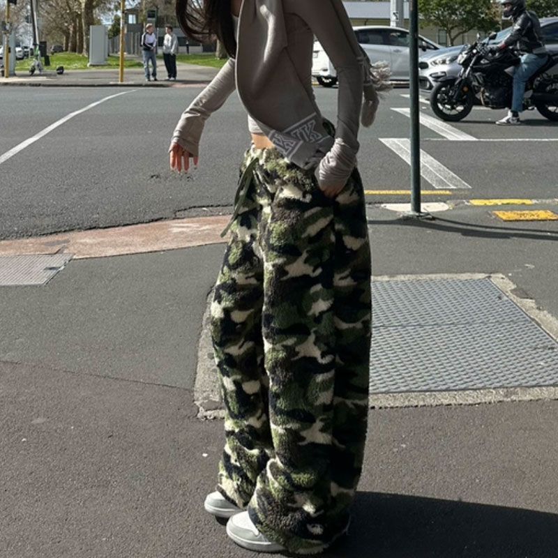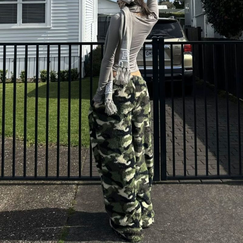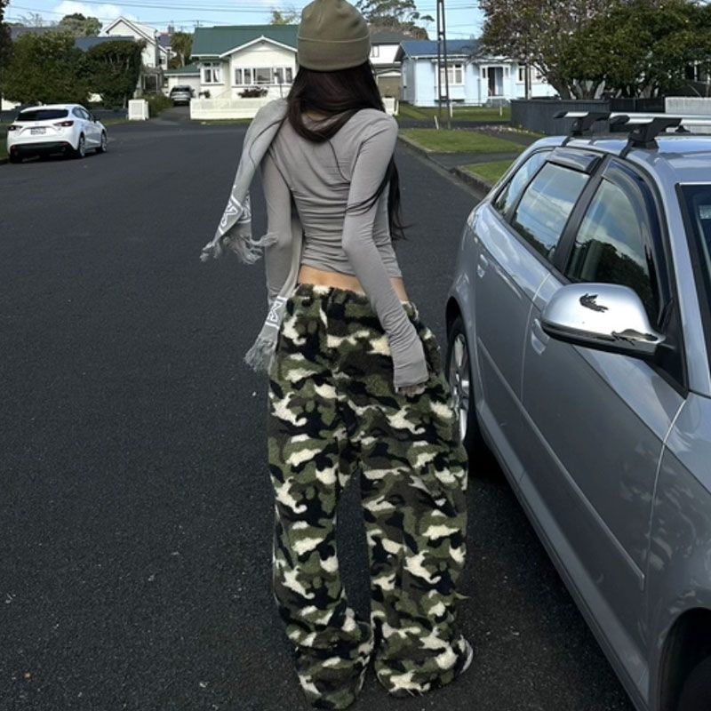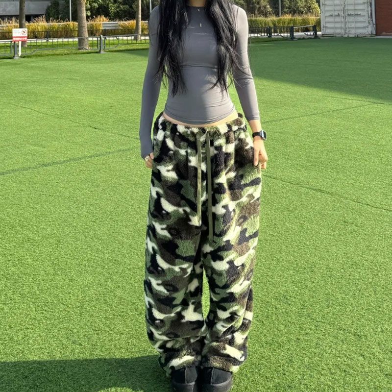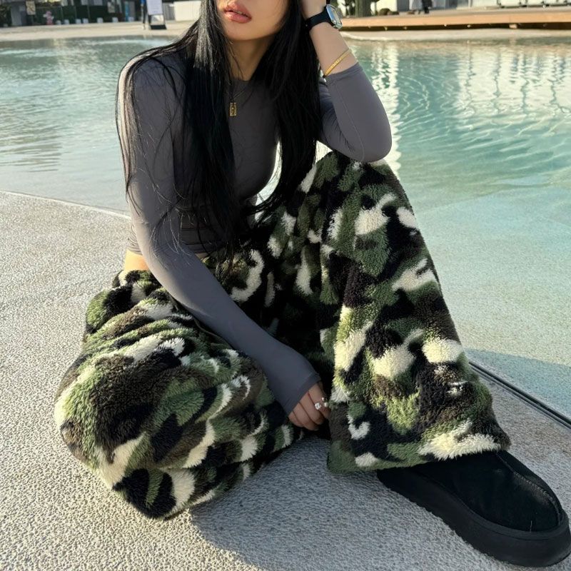 American-style Camo Jacquard Retro Autumnwinter Lambswool Thermal Loose Wide-leg Casual Pants