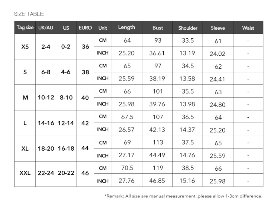 1. Asian sizes are 1 to 2 sizes smaller than European and American people. Choose the larger size if your size between two sizes. Please allow 2-3cm differences due to manual measurement. 2. Please check the size chart carefully before you buy the item, if you don't know how to choose size, please contact our customer service. 3.As you know, the different computers display colors differently, the color of the actual item may vary slightly from the following images.