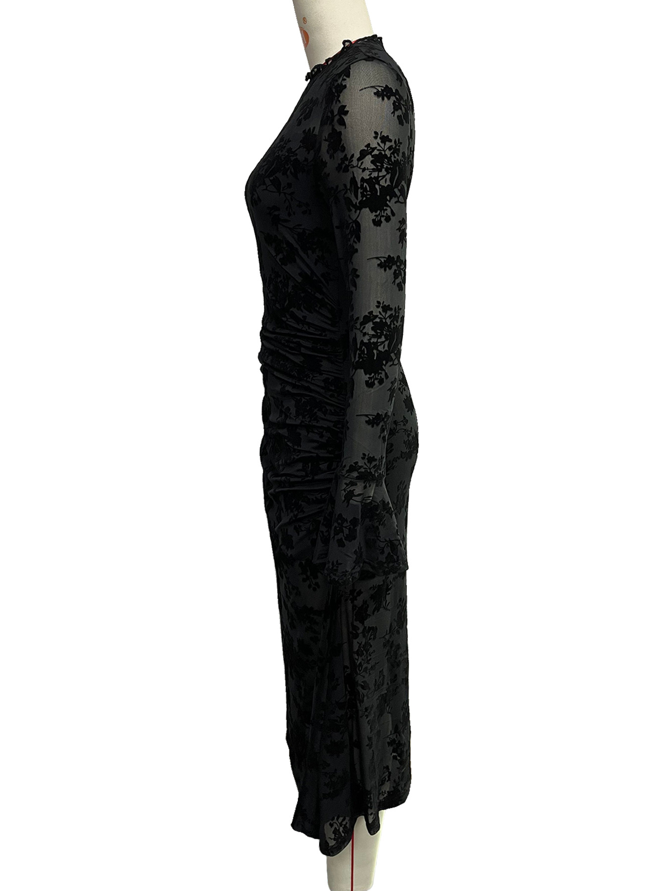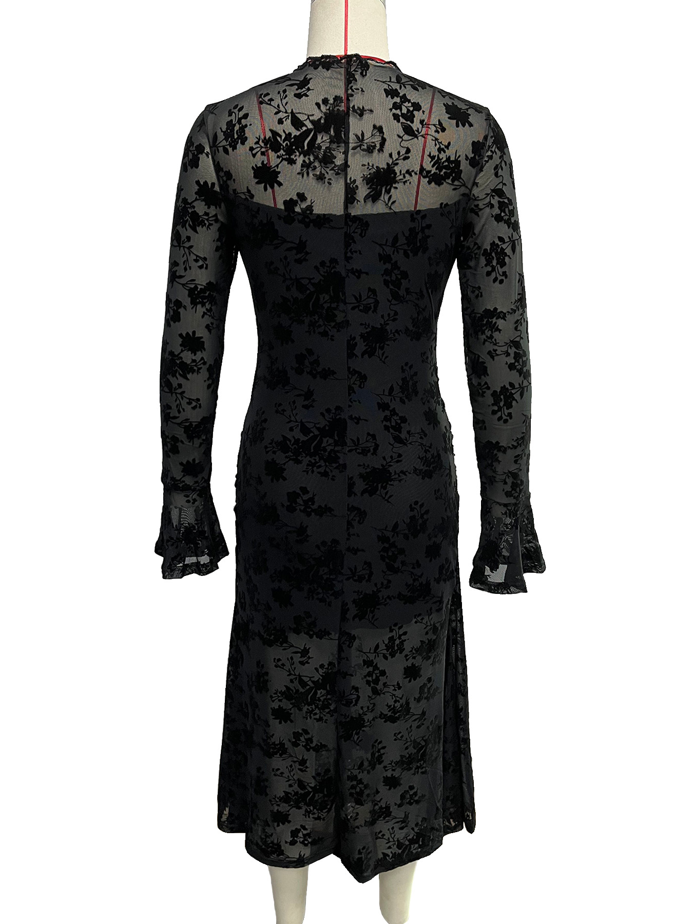 Flocked Mesh Trumpet-sleeve Mermaid Skirt