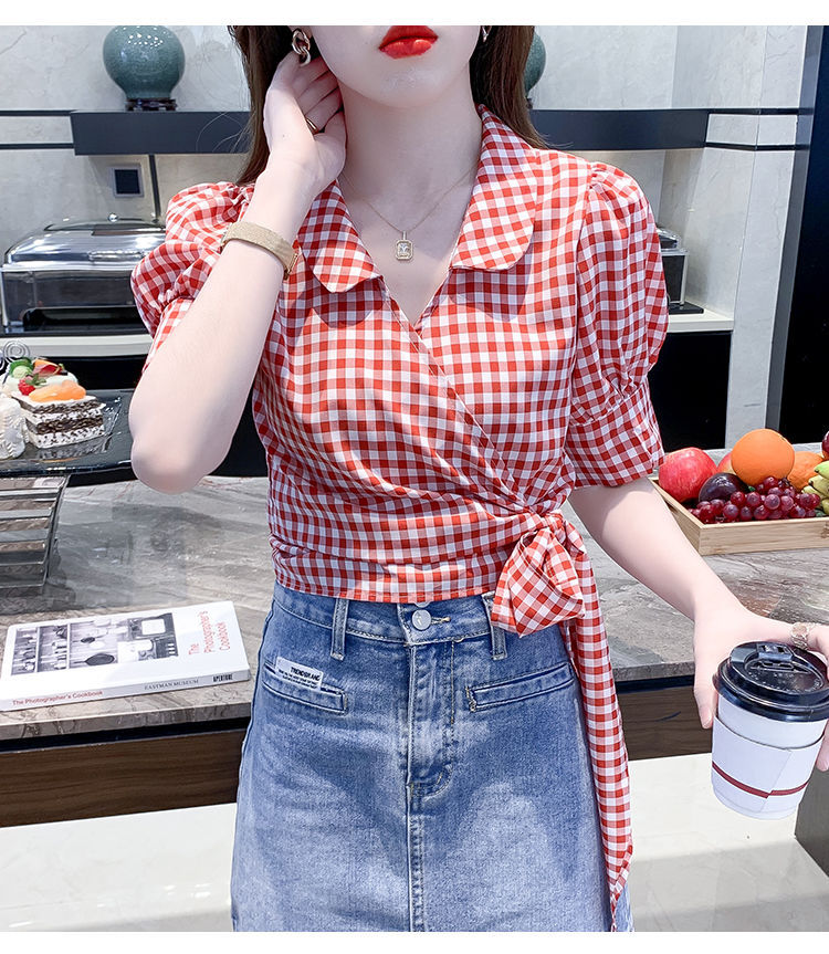 Plaid Shirt Women's Design Sense Niche French Tight Waist Puff Sleeve