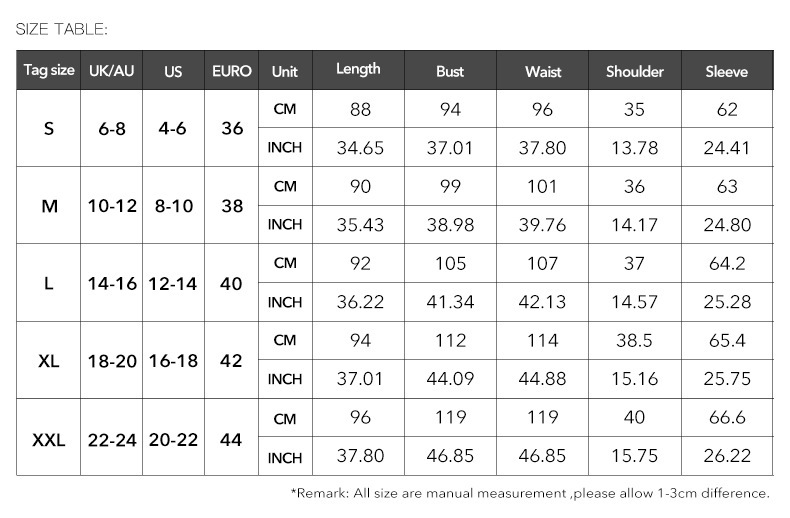 1. Asian sizes are 1 to 2 sizes smaller than European and American people. Choose the larger size if your size between two sizes. Please allow 2-3cm differences due to manual measurement. 2. Please check the size chart carefully before you buy the item, if you don't know how to choose size, please contact our customer service. 3.As you know, the different computers display colors differently, the color of the actual item may vary slightly from the following images.