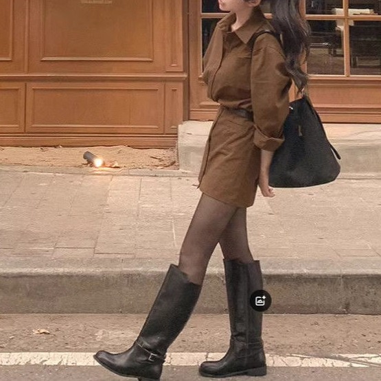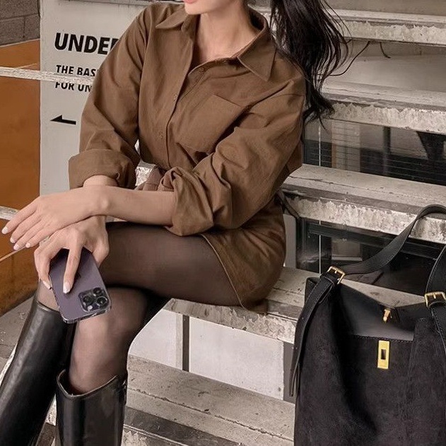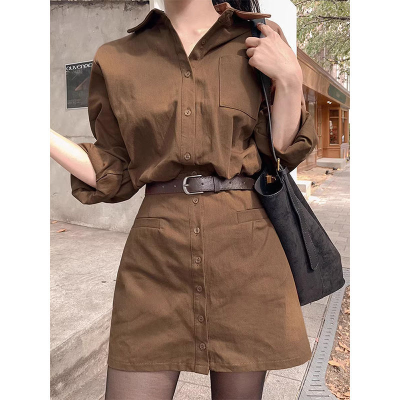 Single-breasted Waist-cinching Slimming Long-sleeve Shirt Dress