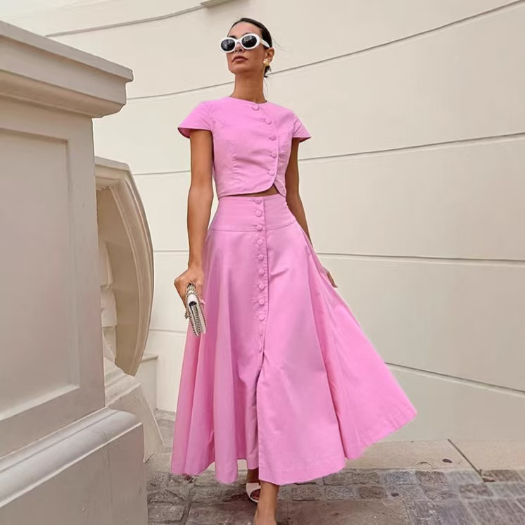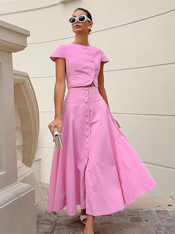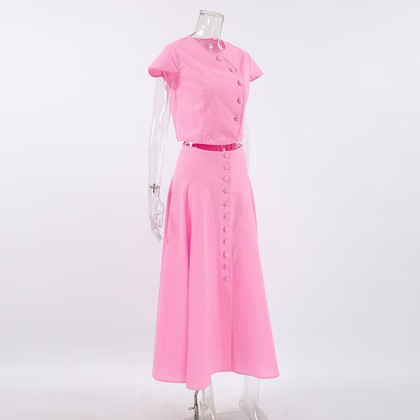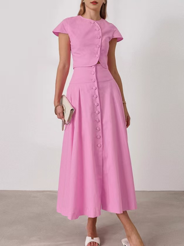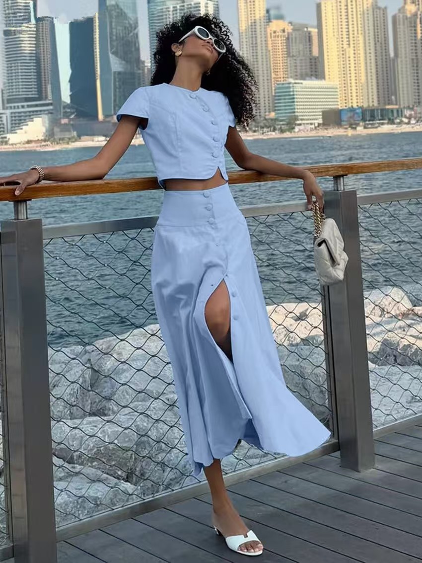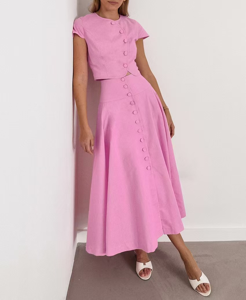 Solid-Color Buttoned Short-Sleeve Top And Flared Maxi Skirt Two-Piece Set