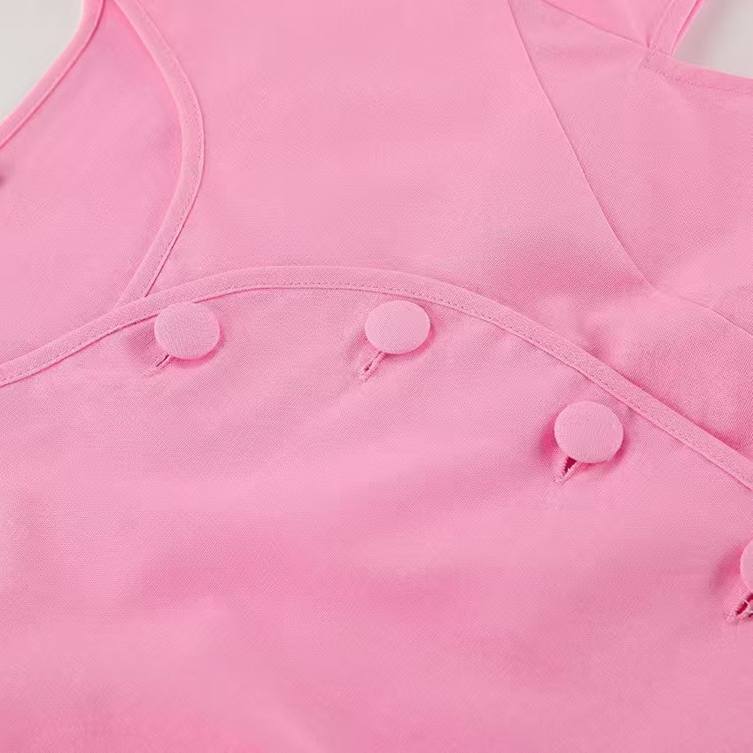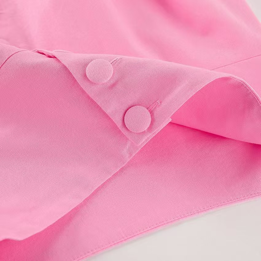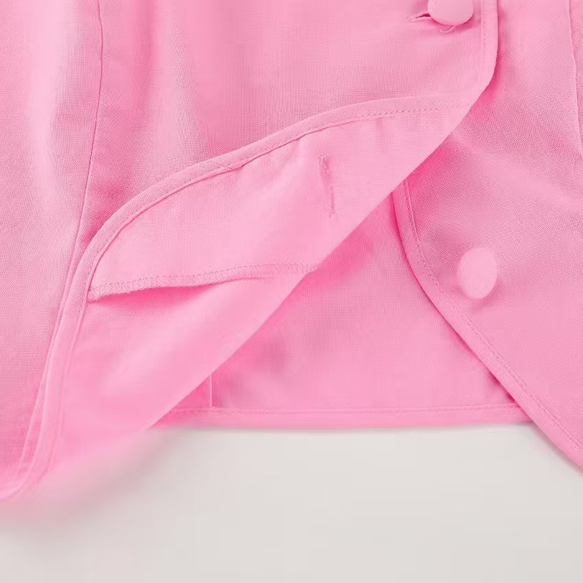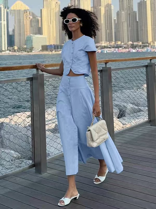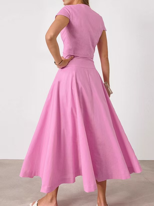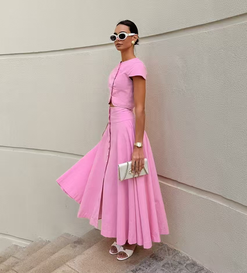 Solid-Color Buttoned Short-Sleeve Top And Flared Maxi Skirt Two-Piece Set