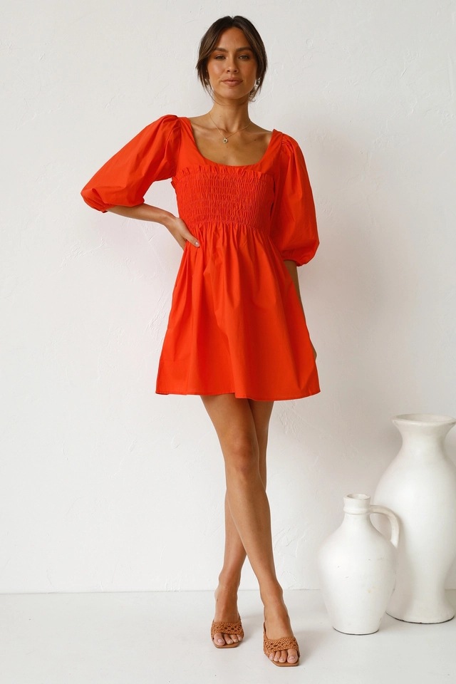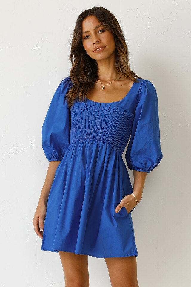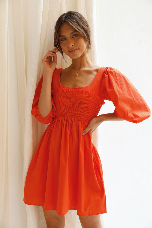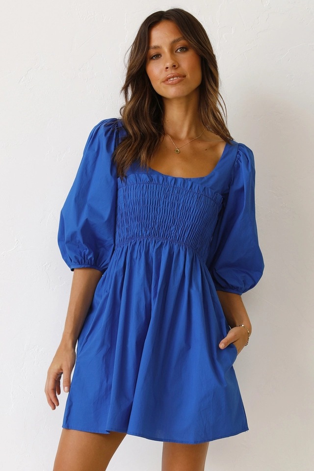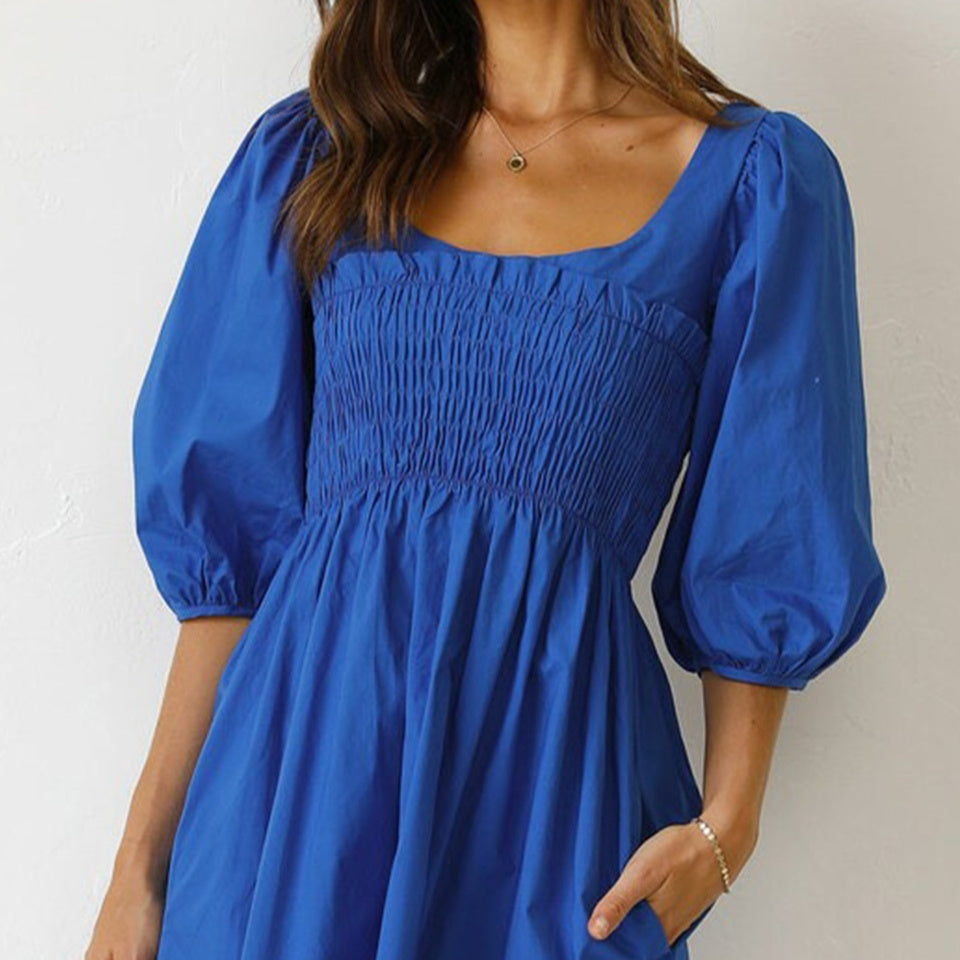 Solid Color U Collar Fitted Waist Sweet Short Dress